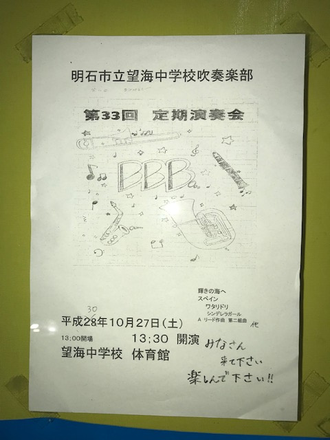聞くと近くの望海中学校吹奏楽部の部員さんで来週第33回定期演奏会をするので来てほしいという案内とそのポスターを貼らせてほしいということでした。