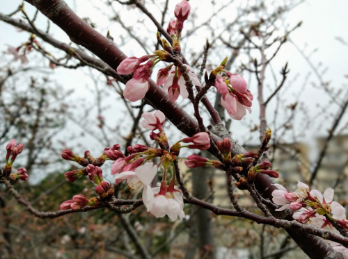 テレビでは、桜が満開の様子が映し出されていますが、近所の桜はやっと咲き始めた感じです。今日も寒いので満開になるまでもう少しかかりそうですが、長く楽しめる方が得をした気分ですね。