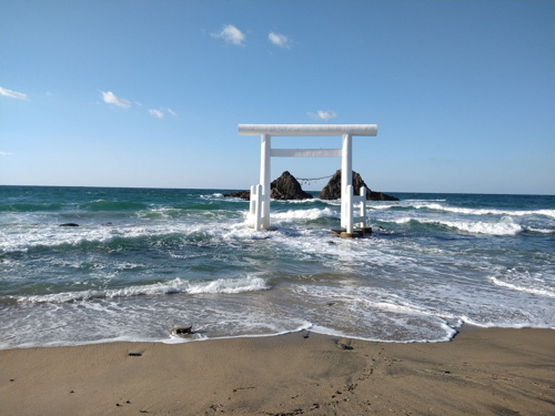 『桜井二見ヶ浦は、市の北部に位置し、夫婦岩は海岸から約150メートルの海中に屹立しています。