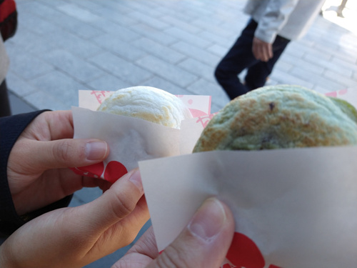 太宰府天満宮と言えば梅が枝餅が有名で、参道のあちこちで売っていて行列が出来るお店もありました。せっかくなので行列に並び、梅が枝餅を頂くことに。白い梅が枝餅とよもぎの梅が枝餅が二種類あるのだと思ったら、よもぎ入りは25日限定だそうで、これは食べるしかない!これも縁です。