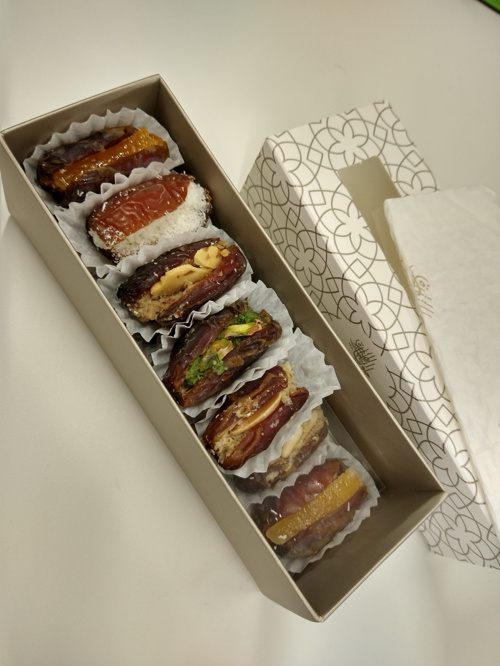 レバノンの老舗スイーツ店のアラスィーと言う会社のお菓子です。商品名はデーツ・ミックスとなっていて、デーツの中にビターオレンジピール、ピスタチオ、ウォールナッツ、ココナッツ、パインナッツなどが挟まれています。どれから食べようか悩ましい感じです。デーツって何だろうと調べたら、