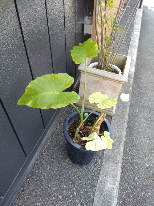 クワズイモは亜熱帯~熱帯地域原産の植物なので高温多湿を好み、春から秋にかけては屋外でも大丈夫なようです。が、直射日光をさけてとなると、お店の裏側しかないのでやっぱり室内で育てるしかない…。取りあえず午前中は日が当たらないのでお店の入り口に置いてあります。元気になって欲しいので植替えも視野に見守りたいと思います。