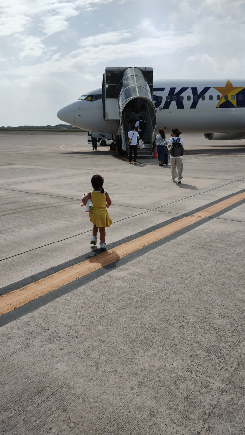飛行機に向かって元気に歩きます。