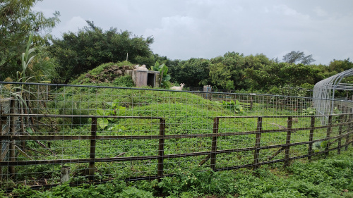 お店の人は台風なので小屋に入ってると思いますと言われたのですが、外に出てて可愛いヤギに会えました。